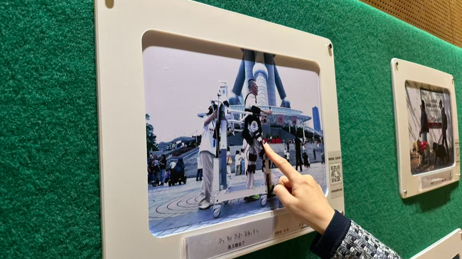 沿着画面中“外骨骼”的轮廓,一圈凸起的小白点让整幅摄影作品看起来不同寻常——这个特别的设计,是让视障朋友在欣赏作品时可以配合一旁的盲文图说,更清晰地感知整幅作品诉说的内容。在今天开启的“江潮同映 镜界共生”2025年首届长三角“三省一市”残健融合摄影展巡展上,29件优秀作品借助盲文凸点印刷技术,加载了“无障碍浏览”功能。在上海图书馆东馆的无障碍阅览室时里,不少参观者触摸着画面上突起的圆点、线条,从另一个角度感受着作品带来的力量。据悉,这些特制作品将在此长期展出。