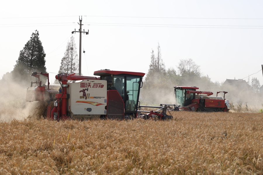 近日,在浙江省嘉兴市嘉善县惠民街道大泖村的稻田里,收割机来回穿梭,金黄稻谷纷纷归仓。这并非普通的稻田,而是上海市金山区枫泾镇新新村与当地合作的20亩富硒大米试验田。