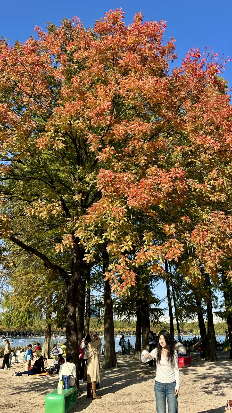 7号门附近,一棵被网友称为“彩虹树”的黄连木,成为很多女孩子专程前来打卡的目标。这棵树高大优雅,临湖而立,红橙黄绿集中在同一棵树上,再配上碧蓝的天空,完美诠释了“一树知秋”的美。树后,还有一片随风摇摆的芦苇荡,成为最佳“出片伴侣”。
