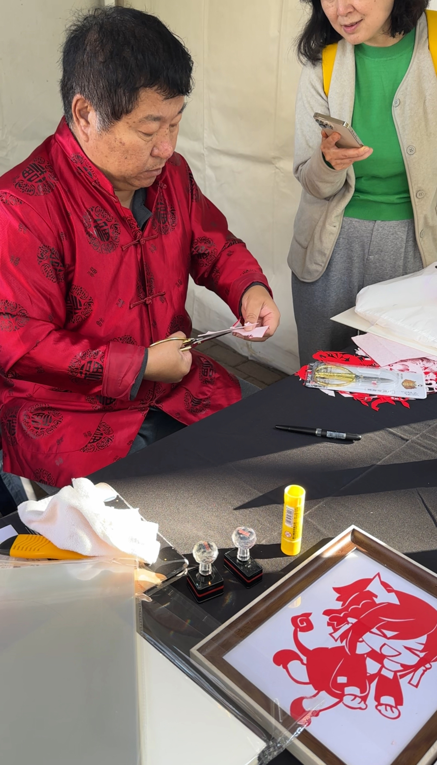 悠扬的乐曲声也飘到了湖畔集市中。在非遗手作艺人义卖区,剪纸和书画扇面摊位前围满了孩子,跟着老师有模有样地做着手工。不一会儿,一幅“双蛇图”剪纸就出现在了一名小男孩手中。